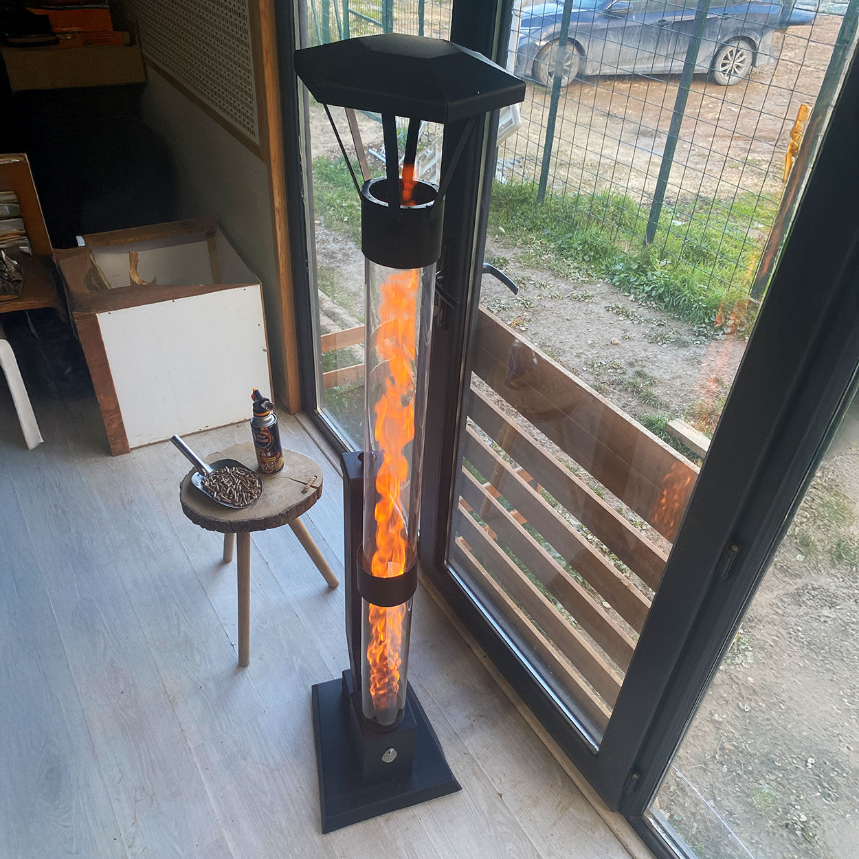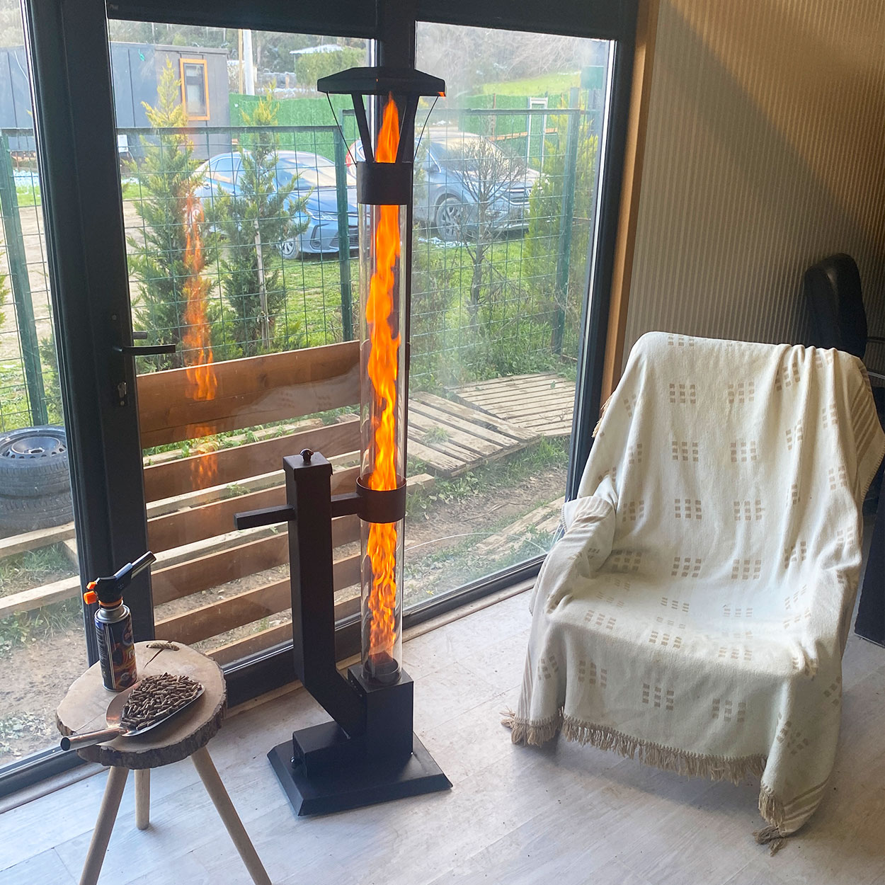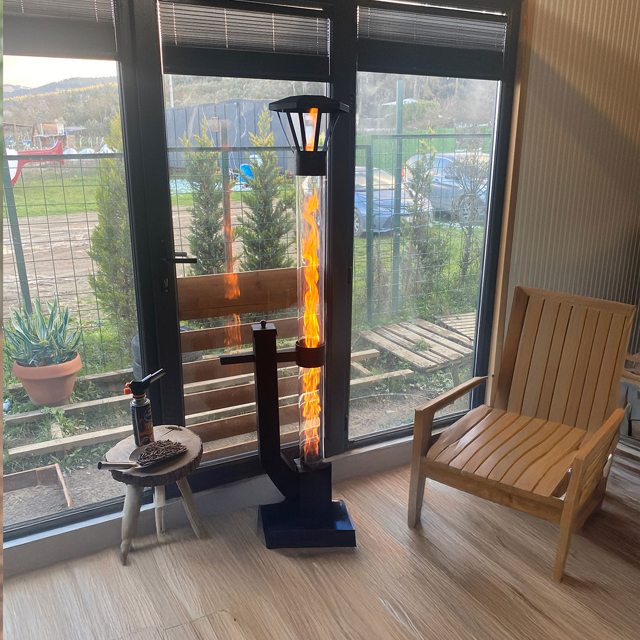 Tepsi Aparatlı 60 cm Camlı Füze Soba + Pürmüz + 2,5 kg Pelet, Tam Set